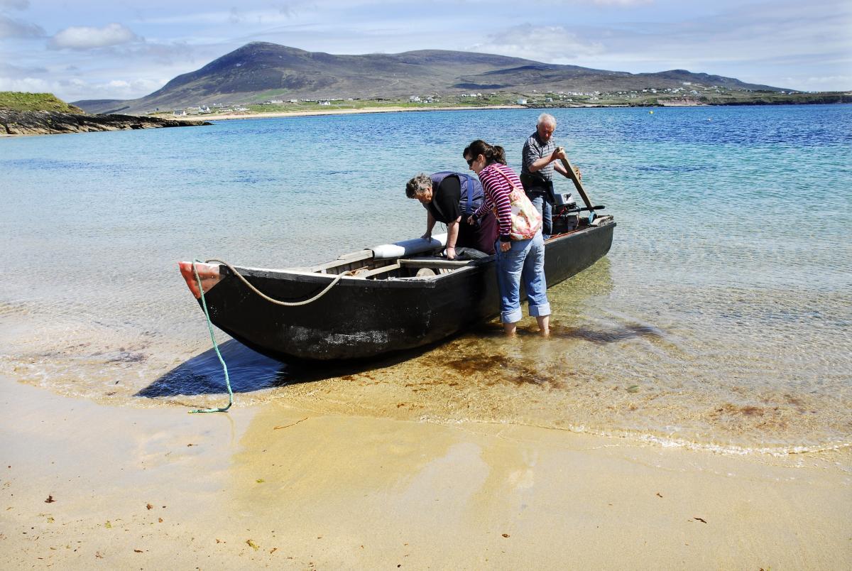 A currach or curragh taking visitors who have been exploring Achillbeg, back to Achill Island.