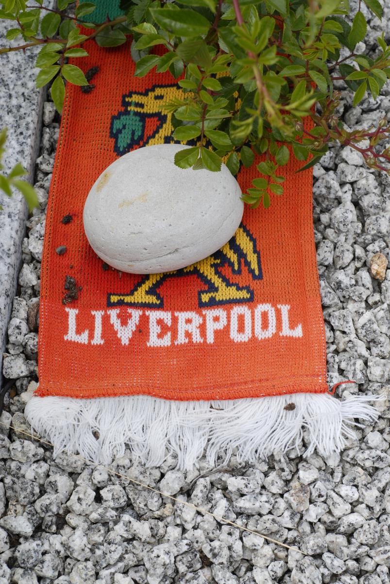 Grave of a Liverpool fan with a stone keeping the scarf from blowing away.