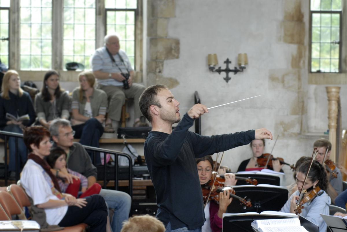 Diego Garcia Rodriguez, seen here in rehearsal with the orchestra in the Great Hall, Dartington at the Dartington Summer School of Music. Diego Garcia was born in Escarabote, Galicia, Spain and is now a professional orchestral conductor. He studied piano and chamber music at the Conservatory Santiago de Compostela and the Conservatoire de Laussanne. He is now well known as a conductor of opera.